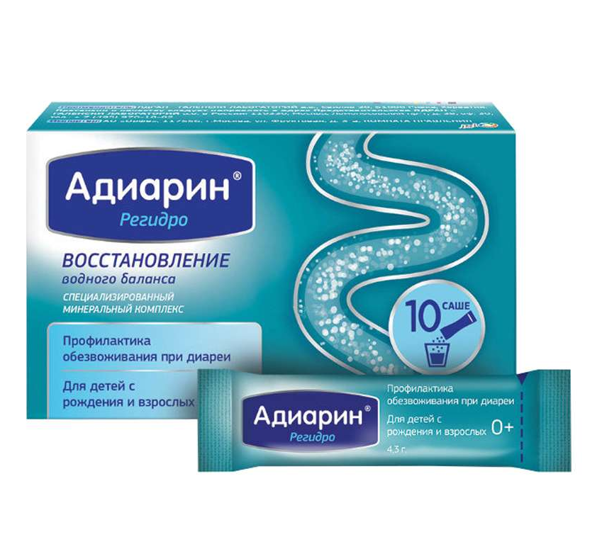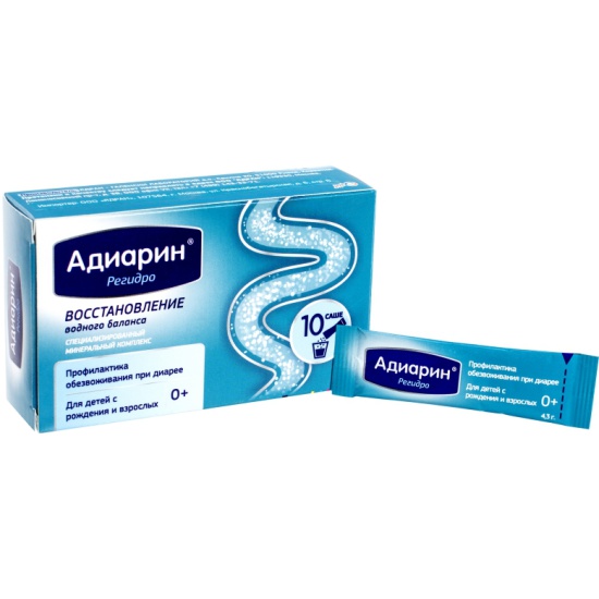 Продукт диетического лечебного питания для детей с первых дней жизни и взрослых, Адиарин® Регидрокомплекс® представляет собой сухую быстрорастворимую смесь, предназначенную для питания детей раннего возраста при обезвоживании организма различной степени тяжести при остром и хроническом диарейном синдроме. Продукт предназначен для коррекции водно-электролитного баланса: предупреждает и уменьшает обезвоживание, восстанавливая потерю воды, натрия и калия, водно-электролитное и кислотно-щелочное равновесие, нарушенное при обезвоживании. По пищевой ценности и содержанию минеральных веществ продукт соответствует стандартам Европейского общества педиатров, гастроэнтерологов и диетологов (ESPGHAN) и ВОЗ.
