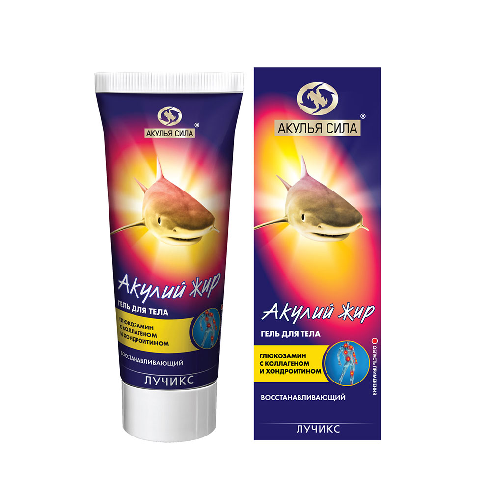 - Гель для тела рекомендуется применять в области суставов и позвоночника. Благодаря содержанию эфирных масел и акульего жира, гель улучшает кровообращение, устраняет отек в околосуставных тканях, подавляет воспалительные процессы, уменьшает боль в суставах и позвоночнике. Входящий в состав коллаген активизирует выработку межсуставной (синовиальной) жидкости, улучшает смазку суставов, восстанавливая их подвижность. Глюкозамин и хондроитин прекрасно питают и восстанавливают хрящевую ткань, снижают потерю кальция, улучшают состояние костей, ускоряют процесс восстановления костей и суставов после травм и переломов, останавливают разрушение «изношенных» суставных хрящей.