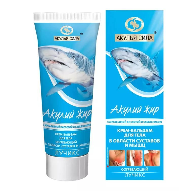 Уникальность и новизна крема-бальзама состоит в том, что в нём впервые были объединены в один препарат три общеизвестных активных природных компонента от суставных и мышечных болей, которые давно и успешно самостоятельно применяются в народной медицине при ревматизме, артритах, остеохандрозе, бурсите, невралгии. Древние японцы считали акулий жир панацеей от всех болезней, рыбаки натирают акульим жиром суставы от ревматизма и артрита, заживляют ожоги и раны. В составе акульего жира содержится большое количество витаминов А, Е, Д. АКУЛИЙ ЖИР обладает противовоспалительным эффектом. САБЕЛЬНИК снимает боль при радикулите, артрите, подагре, болезнях суставов, невралгии, травмах и ушибах, позволяет восстановить нарушенную структуру ткани, убрать очаг воспаления. МУРАВЬИНАЯ КИСЛОТА обладает болеутоляющим, согревающим и противовоспалительным свойствами. Камфора и экстракт перца обладают местноразжижающим и согревающим эффектом, улучшают микроциркуляцию крови, способствуют снятию болевого синдрома и отека в местах воспаления. Витамин Д способствует укреплению костей.