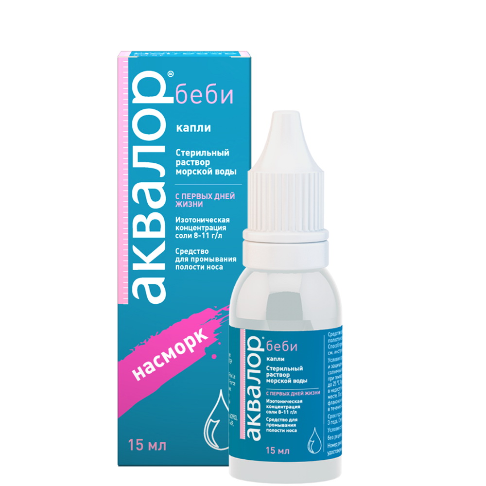 Средство для промывания полости носа для детей «Аквалор беби» 15 мл представляет собой пластиковый флакон-капельницу, герметично закрытый завинчивающейся пластиковой крышкой. Содержание флакона-капельницы – прозрачная бесцветная жидкость без запаха, со слабосоленым вкусом, являющаяся стерильным раствором морской воды (в 100 мл содержится 30-33 мл натуральной морской воды) с изотонической концентрацией NaCl. Не содержит консервантов. Не является лекарственным средством. Средство для промывания полости носа для детей «Аквалор беби» предназначено для детей с рождения.