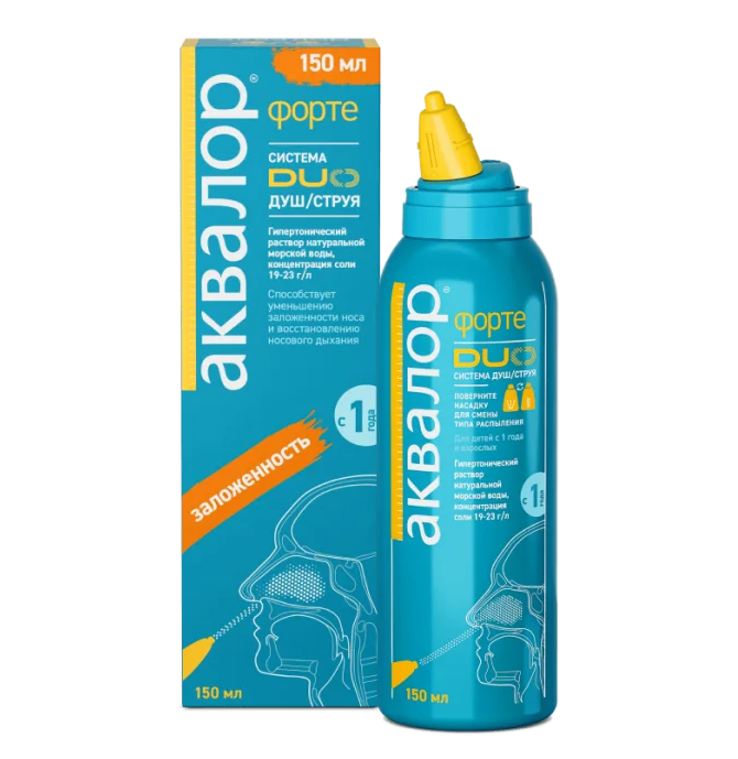Средство для орошения и промывания полости носа для детей и взрослых в вариантах исполнения «Аквалор® форте мини» 50 мл, «Аквалор® форте» 150 мл по ТУ 32.50.50-010-00480081-2017.