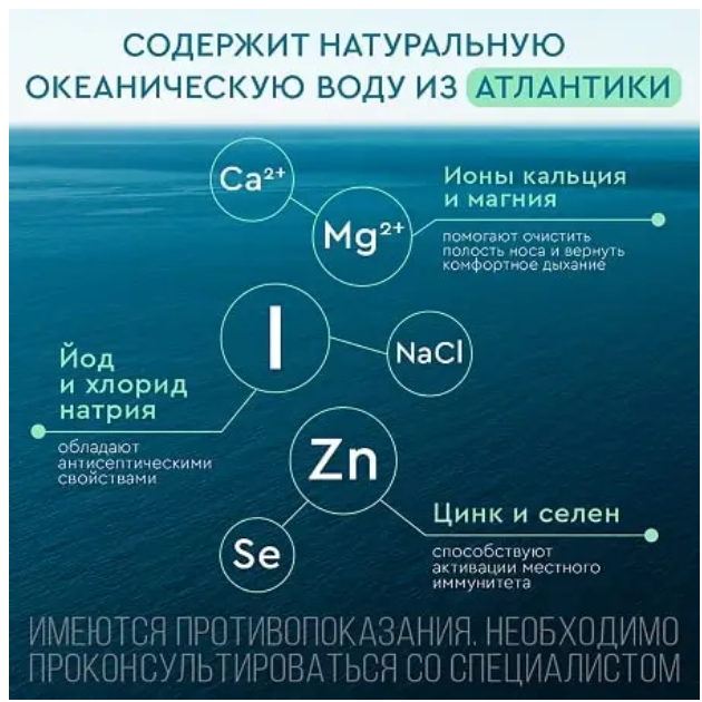 | Состав содержимого | изотонический раствор морской воды (концентрация NaCl 8 - 11 г/л), содержащий воду морскую натуральную, воду очищенную. Забор воды морской осуществляется из экологически чистых районов у берегов Бретани (Франция), Люсешил (Швеция). Вода морская содержит ионы натрия, калия, цинка, селена, магния, кальция, йода, хлора, брома. рН 6,0 - 8,5 не содержит консервантов. |