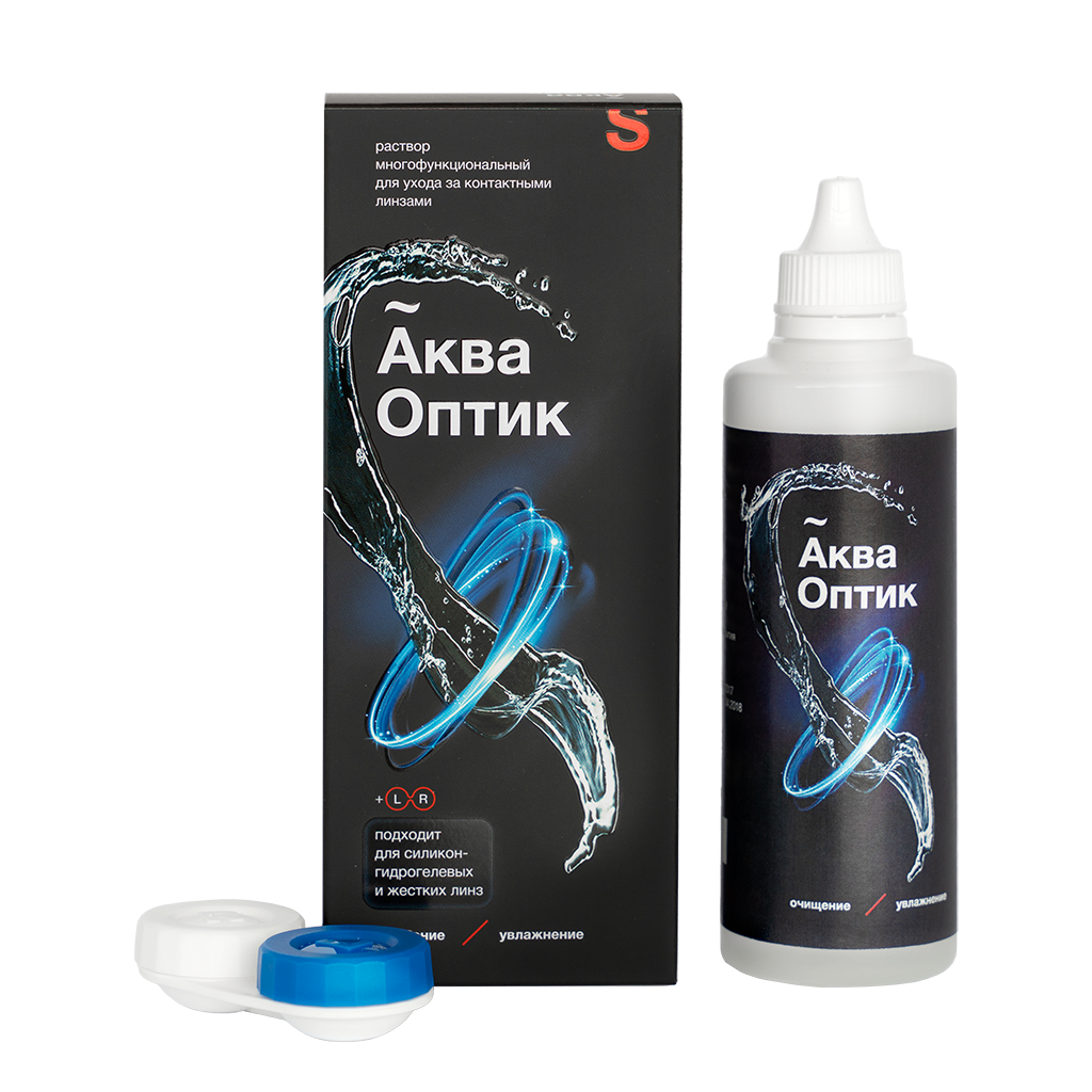 Раствор многофункциональный для ухода за контактными линзами АкваОптик (далее - раствор) представляет собой прозрачный или слегка опалесцирующий бесцветный раствор.