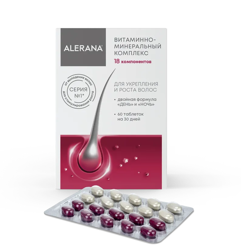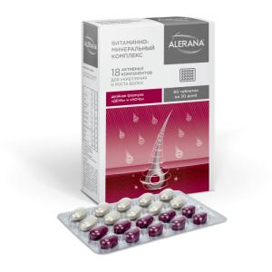 Витаминно-минеральный комплекс ALERANA является дополнительным источником витаминов, аминокислот и минеральных веществ (макро- и микроэлементов),необходимых для укрепления и роста здоровых волос, а также улучшения состояния кожи головы у женщин и мужчин для предотвращения сечения и выпадения волос.