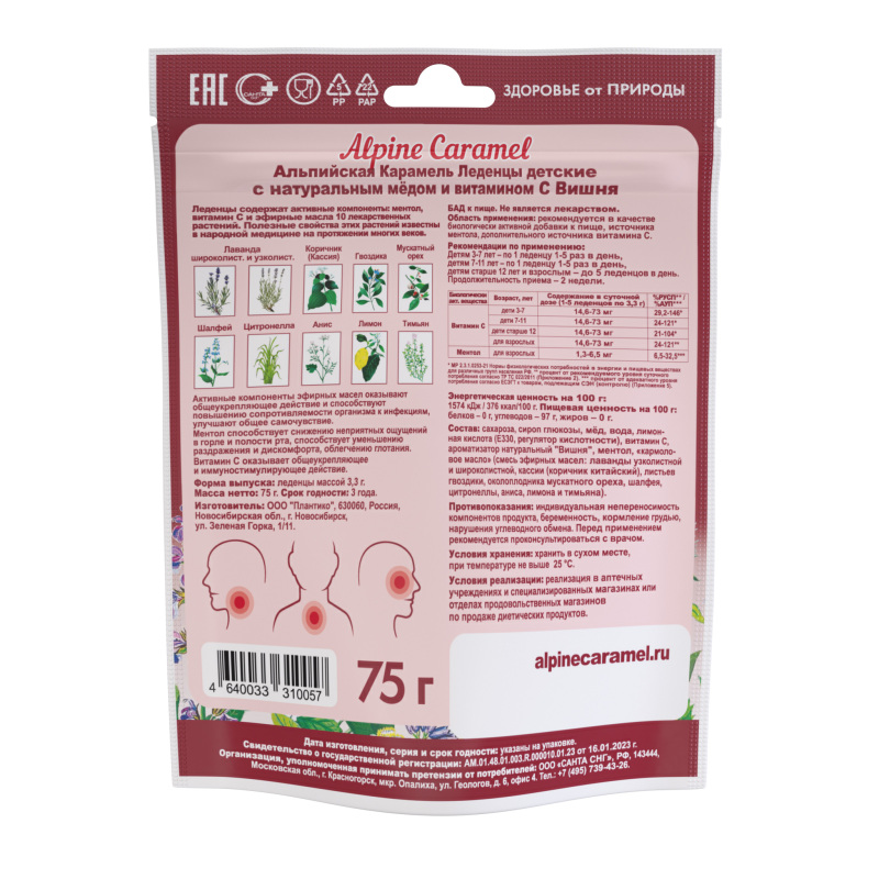 Леденцы Alpine Caramel Альпийская Карамельсодержат кармоловое масло (комплекс эфирных масел десяти лекарственных растений), витамин С и натуральный мед. Полезные свойства входящих в состав лекарственных растений известны на протяжении многих веков. Состав проверен временем и подбирался с учетом синергии компонентов, когда в комплексе они дополняют и усиливают действие друг друга. Комплекс эфирных масел обладает антисептическим, противомикробным, противовирусным, иммуностимулирующим и общеукрепляющим действием. Натуральный ароматизатор из сока малины смягчает вкус эфирных масел. Рекомендованы детям от 3 лет и старше. Дополнительный источник витамина С. Могут использоваться для облегчения симптомов укачивания в транспорте.