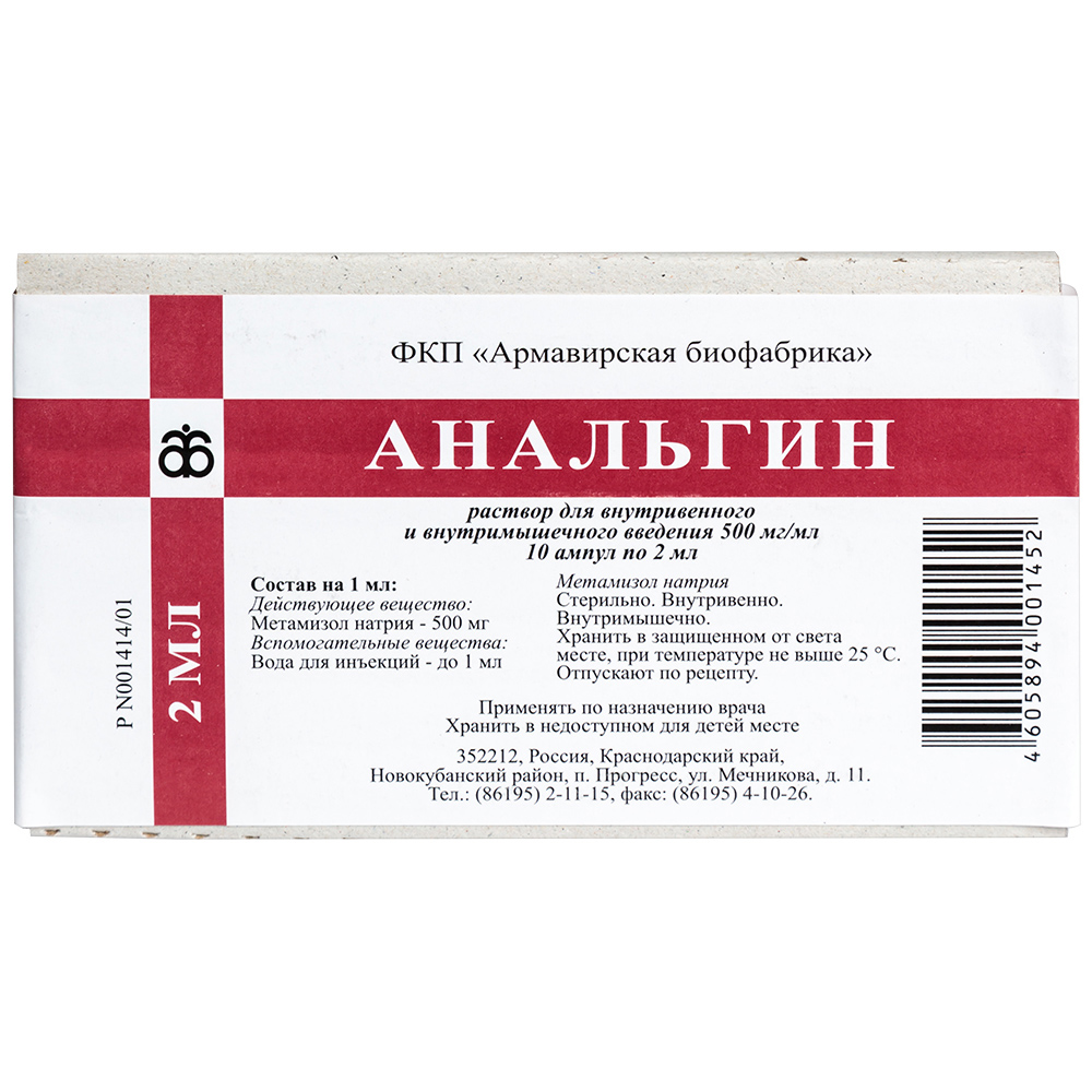 Анальгин раствор для внутривенного и внутримышечного введения 500мг/мл ампулы 2мл №10