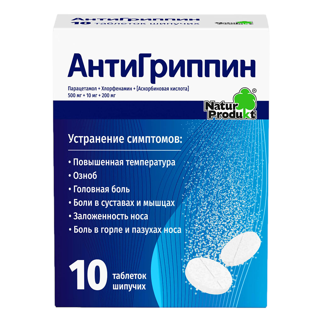 Активные вещества: парацетамол — 500,00 мг, хлорфенамина малеат — 10,00 мг, аскорбиновая кислота — 200,00 мг.
