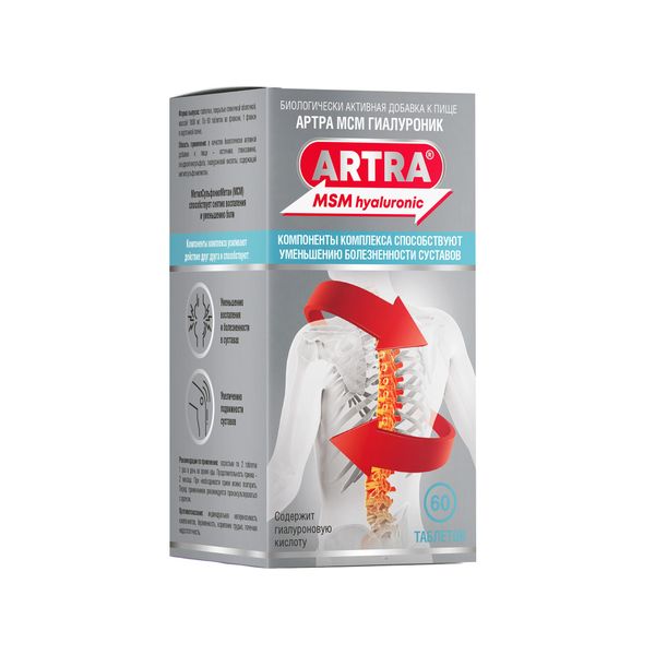 БИОЛОГИЧЕСКИ АКТИВНАЯ ДОБАВКА К ПИЩЕ АРТРА МСМ ГИАЛУРОНИК (далее АРТРА МСМ ГИАЛУРОНИК) содержит высокие концентрации глюкозамина, хондроитина, гиалуроновой кислоты и метилсульфонилметана (МСМ), которые в комбинации обладают синергическим эффектом, дополняя и усиливая эффекты друг друга. Хондроитин и глюкозамин играют важнейшую роль в восстановлении соединительной ткани, улучшают амортизационные свойства хряща, увеличивают подвижность суставов.