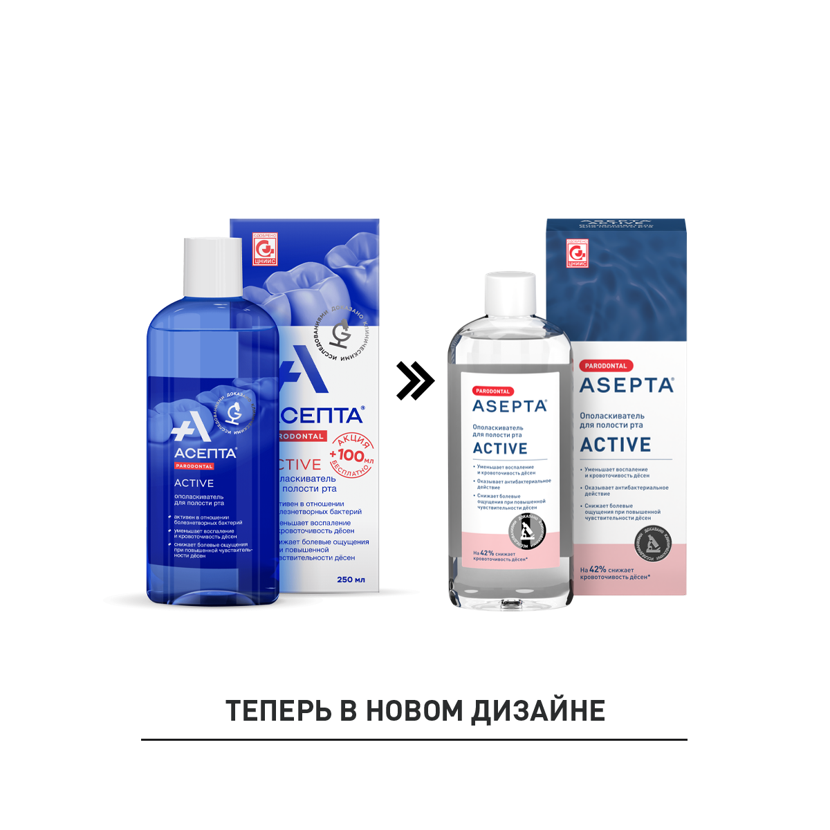 АСЕПТА Актив - единственный ополаскиватель с комбинацией «хлоргексидин + бензидамин», которая показала высокую эффективность при инфекционно-воспалительных заболеваниях полости рта, кровоточивости и воспалениях дёсен.