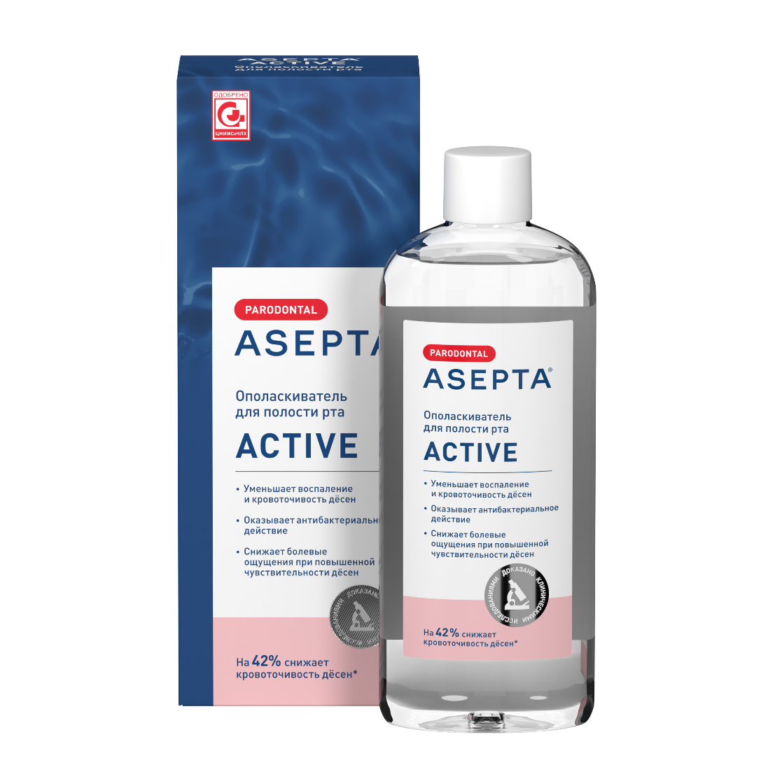 АСЕПТА АКТИВ ОПОЛАСКИВАТЕЛЬ ДЛЯ ПОЛОСТИ РТА АКТИВ - комбинированный ополаскиватель для полости рта с двухкомпонентной формулой (хлоргексидин + бензидамин) для лечения воспалительных заболеваний пародонта.
