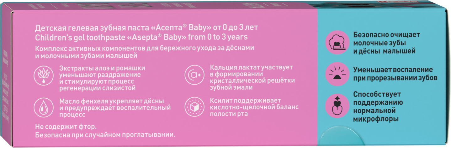 Благодаря приятному вкусу Тутти-фрутти, зубная паста «АСЕПТА baby» помогает сформировать у ребёнка навык ежедневной гигиены ротовой полости.