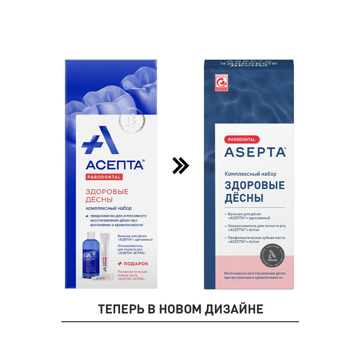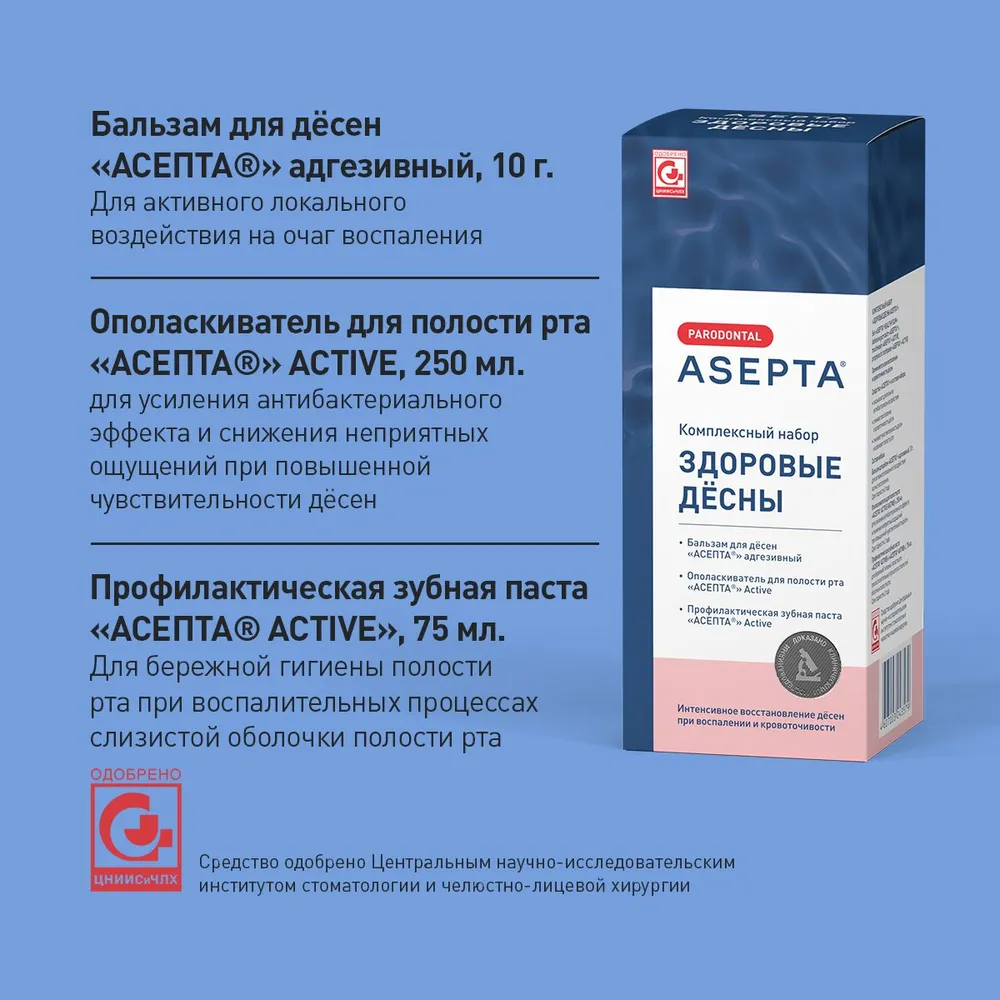 Набор «Асепта Здоровые десны» представляет собой комплекс из трех средств серии «Асепта», которые обеспечивают максимально активное снятие воспаления пародонта: