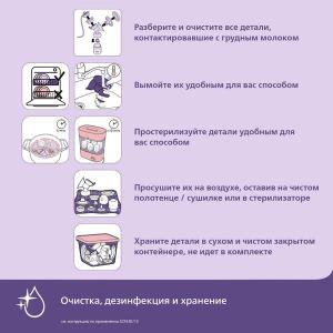 Легкий процесс сцеживания молока напрямую в герметичный контейнер для хранения, во избежание утечки или пролива молока. Когда малыш проголодается, просто прикрепите соску к контейнеру для кормления. Храните молоко в холодильнике или морозильной камере. Самостоятельно и свободно настраивайте ритм работы молокоотсоса во время фаз стимуляции и сцеживания, чтобы обеспечить комфортный вам поток молока. Легко мыть и собирать - небольшое количество деталей молокоотсоса позволяют без труда собирать и очищать молокоотсос.