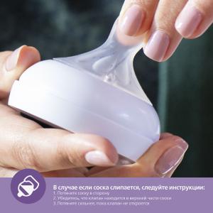Соска Natural - соска ощущается как грудь. Легко сочетать c кормлением грудью и из бутылочки. Соска Natural Response - молоко выделяется только при активном сосании: соска ощущается и работает, как грудь. Конструкция соски позволяет избежать случайное проливание молока. Совместимы с клапаном AirFree, снижающим риски образования колик, газов и срыгивании.