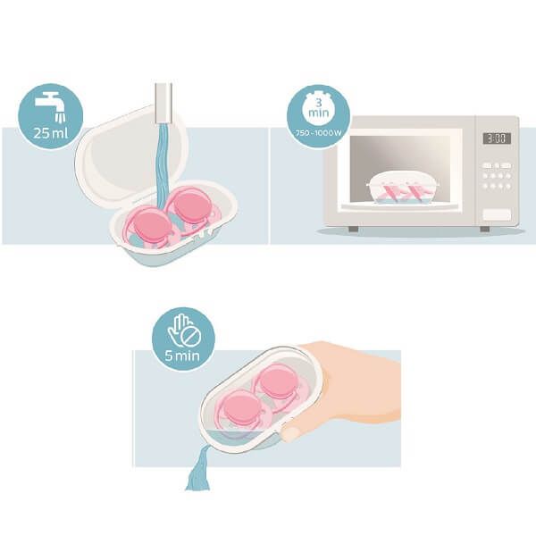 Положите в футляр хорошо промытые пустышки, добавьте 25 мл воды и поставьте его в микроволновую печь на 3 минуты при мощности 750-1000 Вт. Охладите в течение 5 минут, вылейте из футляра воду - и процесс завершен!