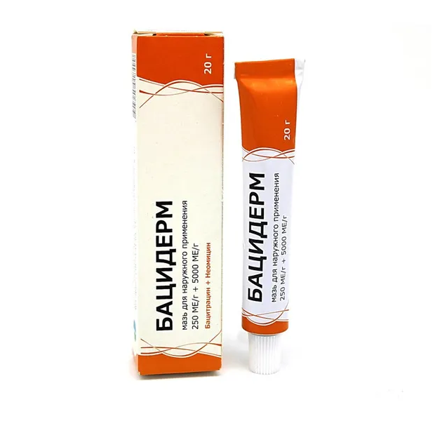 БАЦИДЕРМ является комбинированным антибактериальным препаратом, предназначенным для наружного применения. Препарат содержит два бактерицидных антибиотика: неомицин и бацитрацин. Бацитрацин является полипептидным антибиотиком, который ингибирует синтез клеточной оболочки бактерий. Неомицин является антибиотиком-аминогликозидом. который ингибирует синтез белков бактерии.