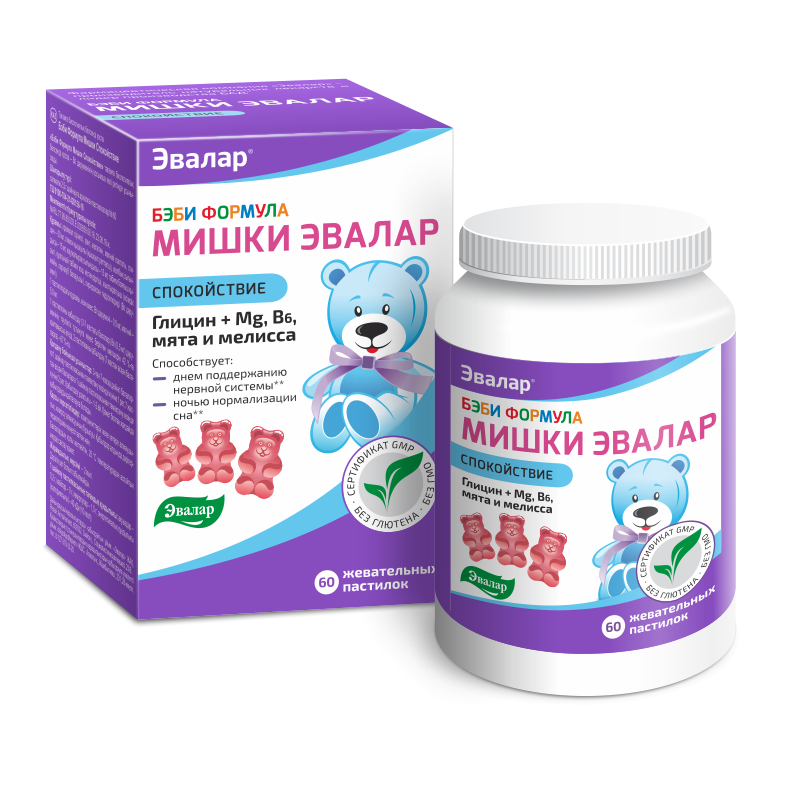 Глицин снижает беспокойство, снимает стресс, стимулирует умственную деятельность, устраняет агрессию, нормализует сон, предупреждает мозговые и вегето-сосудистые расстройства. На сегодняшний день Бэби Формула Мишки Спокойствие Эвалар – это единственные пастилки для детей, содержащие в своем составе глицин3.