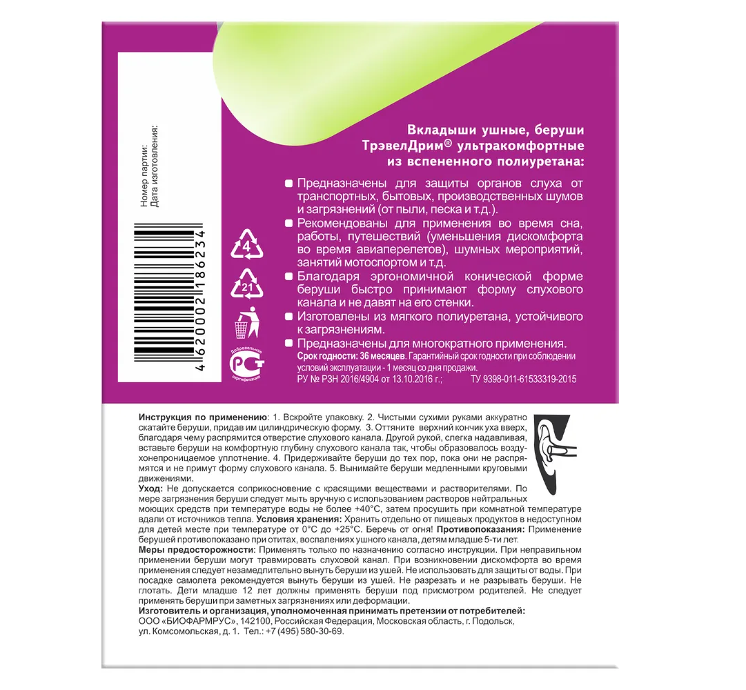 Применять только по назначению согласно инструкции. При неправильном применении беруши могут травмировать слуховой канал. При возникновении дискомфорта во время применения следует незамедлительно вынуть беруши из ушей. Не разрезать и не разрывать беруши. Не глотать. Дети младше 12 лет должны применять беруши под присмотром родителей.