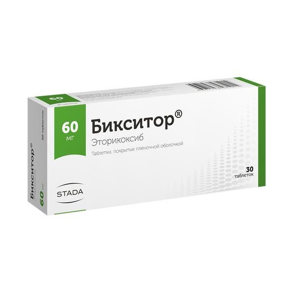 Ацетилсалициловая кислота. В исследовании с участием здоровых добровольцев эторикоксиб в дозе 120 мг в день в равновесном состоянии не влиял на антитромбоцитарную активность ацетилсалициловой кислоты (81 мг 1 раз в день). Препарат Бикситор® можно применять одновременно с ацетилсалициловой кислотой в низких дозах, предназначенных для профилактики СС заболеваний. Однако одновременное назначение низких доз ацетилсалициловой кислоты и эторикоксиба может привести к увеличению частоты язвенного поражения ЖКТ и других осложнений по сравнению с приёмом одного эторикоксиба. Одновременное применение эторикоксиба с ацетилсалициловой кислотой в дозах, превышающих рекомендованные для профилактики СС осложнений, а также с другими НПВП не рекомендуется.