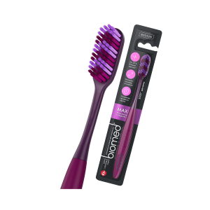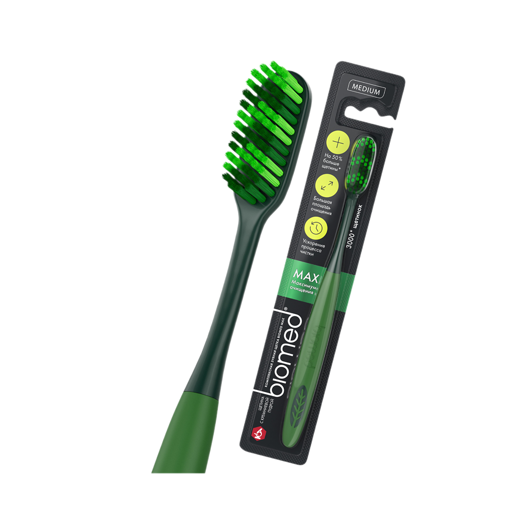 Зубная щетка Biomed MAX очищает больше зубов за одно движение. Более 3000 щетинок, покрытых кремниевой пудрой, гарантируют эффективное удаление налета. Закругленные кончики щетинок прошли 6 стадий шлифовки и 2 полировки сапфировыми дисками, обеспечивая безопасную и бережную чистку зубов и десен.