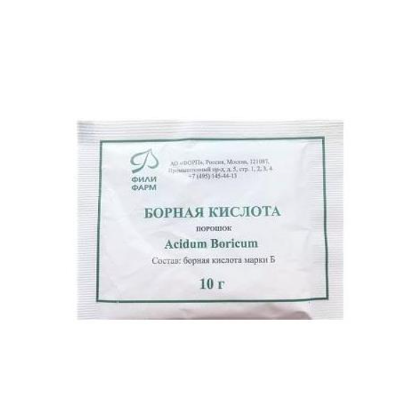 Борная кислота - антисептическое средство, оказывает также инсектицидное (в т. ч. противопедикулезное) действие. Коагулирует белки (в т. ч. ферментные) микробной клетки, нарушает проницаемость клеточной оболочки. 5% водный раствор подавляет процессы фагоцитоза, 2 4% раствор задерживает рост и развитие бактерий.