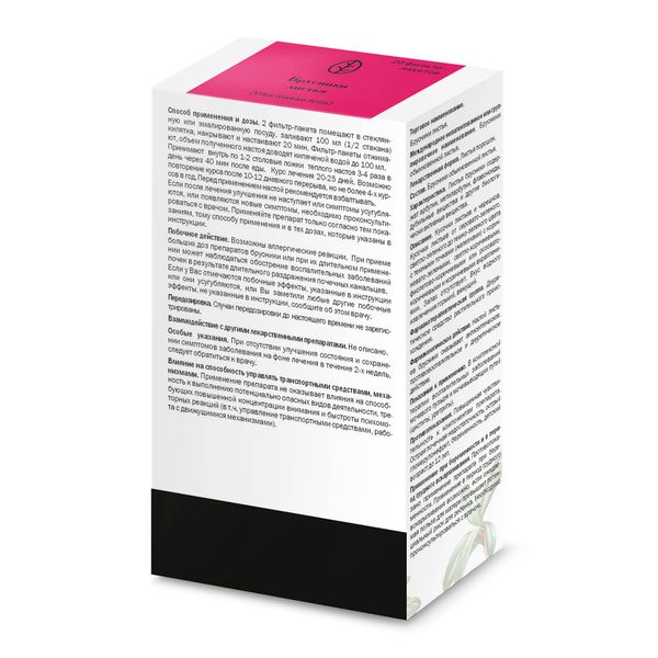 2 фильтр-пакета помещают в стеклянную или эмалированную посуду, заливают 100 мл (½ стакана) кипятка, накрывают крышкой и настаивают в течение 20 мин. Фильтр-пакеты отжимают. Объём полученного отвара доводят кипячёной водой до 100 мл.