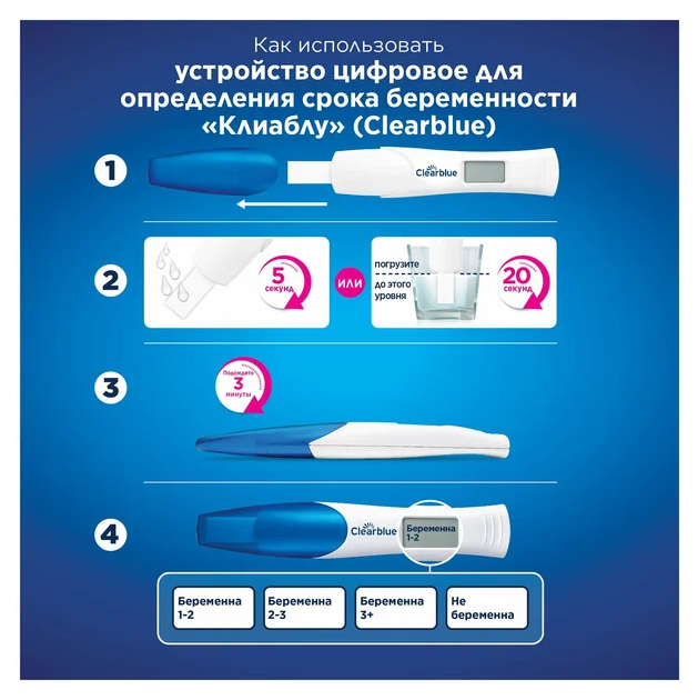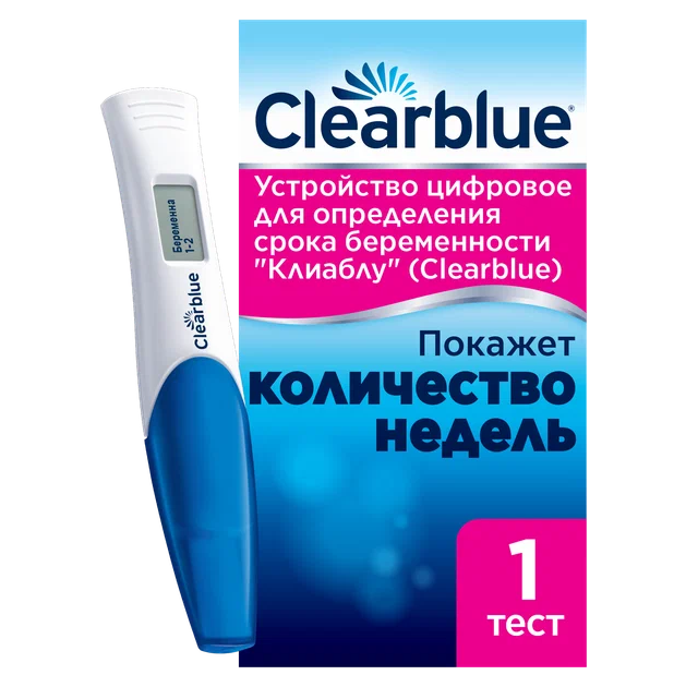 Устройство цифровое для определения срока беременности «Клиаблу» (Clearblue) — это первый и единственный тест, такой же точный в определении срока беременности, как ультразвуковое исследование (1). Его интеллектуальный двойной датчик не только показывает вам словами на цифровом дисплее, беременны вы или нет, но и то, какой у вас срок: количество недель с момента зачатия отображается как 1–2, 2–3 или 3+. (2) С помощью этого теста на беременность можно делать тест за 5 дней до задержки месячных (то есть за 4 дня до ожидаемого начала менструации). 65 % случаев результатов «Беременна» можно обнаружить уже за 5 дней до задержки месячных.