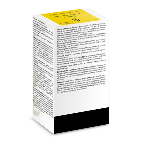 Порошок. 2 фильтр-пакета помещают в стеклянную или эмалированную посуду, заливают 100 мл (½ стакана) кипятка, накрывают и настаивают 15 минут. Фильтр-пакеты отжимают, объём полученного настоя доводят кипячёной водой до 100 мл.