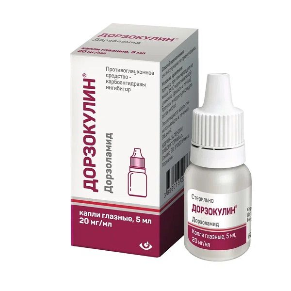 Карбоангидраза (СА) представляет собой фермент, находящийся во многих тканях организма, включая глаз. У человека карбоангидраза представлена рядом изоферментов, наиболее активным среди которых является карбоангидраза II (СА-II), обнаруживаемая главным образом в эритроцитах, а также в других тканях. Ингибирование карбоангидразы в цилиарных отростках глаза приводит к снижению секреции водянистой влаги, в результате чего происходит снижение внутриглазного давления (ВГД). Препарат Дорзокулин® содержит дорзоламида гидрохлорид, который является сильным селективным ингибитором карбоангидразы II человека. После местного офтальмологического применения дорзоламида повышенное ВГД снижается независимо от того, связано оно с глаукомой или нет. Повышенное ВГД является основным фактором риска в патогенезе повреждения зрительного нерва и сужения полей зрения. Дорзоламид снижает ВГД без общих для миотических препаратов побочных действий, таких как никталопия, спазм аккомодации и сужение зрачков. Дорзоламид оказывает минимальное или практически не оказывает влияния на частоту пульса или артериальное давление. Бета-адреноблокаторы для местного применения в офтальмологии также снижают ВГД за счет уменьшения продукции водянистой влаги, однако механизм их действия отличается. По результатам исследований показано, что при добавлении дорзоламида к бета-адреноблокаторам для местного применения в офтальмологии отмечается дополнительное снижение ВГД. Это подтверждает ранее полученные данные об аддитивном эффекте при совместном применении бета-адреноблокаторов и пероральных ингибиторов карбоангидразы.