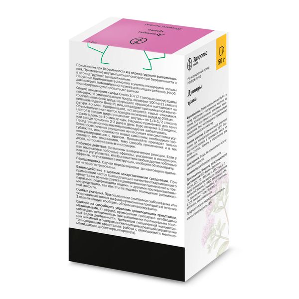 Трава измельчённая по 50 г в пачке картонной с внутренним пакетом. Текст инструкции по применению полностью нанесен на пачку.