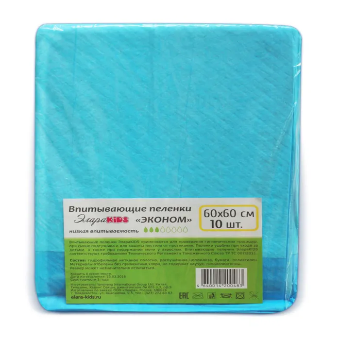 Пеленки Элара Kids "Эконом" Одноразовые впитывающие пеленки Элара Kids "Эконом" – это качественный продукт по доступной цене. Наши пеленки имеют смешанное наполнение, включающее абсорбент, поэтому впитывают больше, чем пеленки, содержащие целлюлозу. Верхний слой изготовлен из специального мягкого гипоаллергенного нетканого материала, который защитит иммунитет и кожу вашего малыша. А защитные бортики по бокам не дадут жидкости вылиться за края.