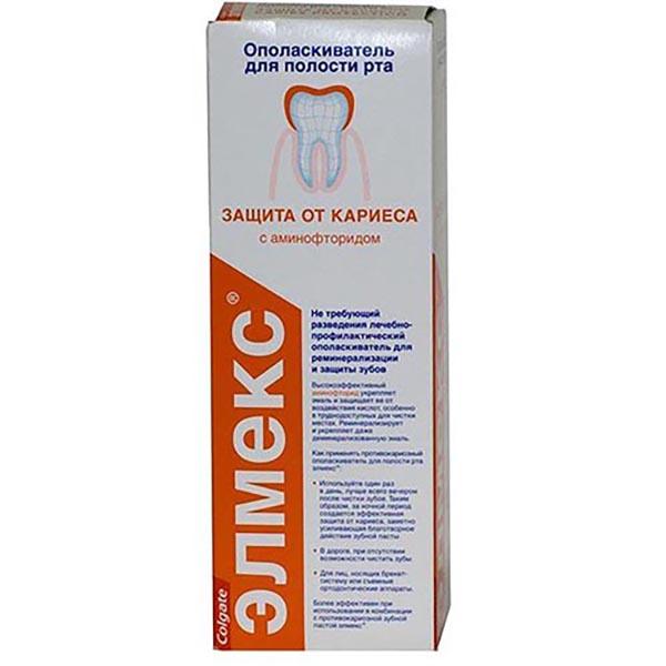 - Ополаскиватель для полости рта Elmex Защита от кариеса предназначен для ежедневной гигиены. Высокоэффективный аминофторид, входящий в состав ополаскивателя, защищает зубы от кариеса, замедляет рост бактерий, образующих зубной налет. Ополаскиватель Elmex Защита от кариеса способствует укреплению зубной эмали, снижает ее растворимость и стимулирует процессы реминерализации. Ополаскиватель для полости рта Elmex Защита от кариеса помогает очистить участки зубов, труднодоступные для зубной щетки. Особенно рекомендован при наличии ортодонтических конструкций (брекет-систем и пр.), несъемных и частично съемных зубных протезов.