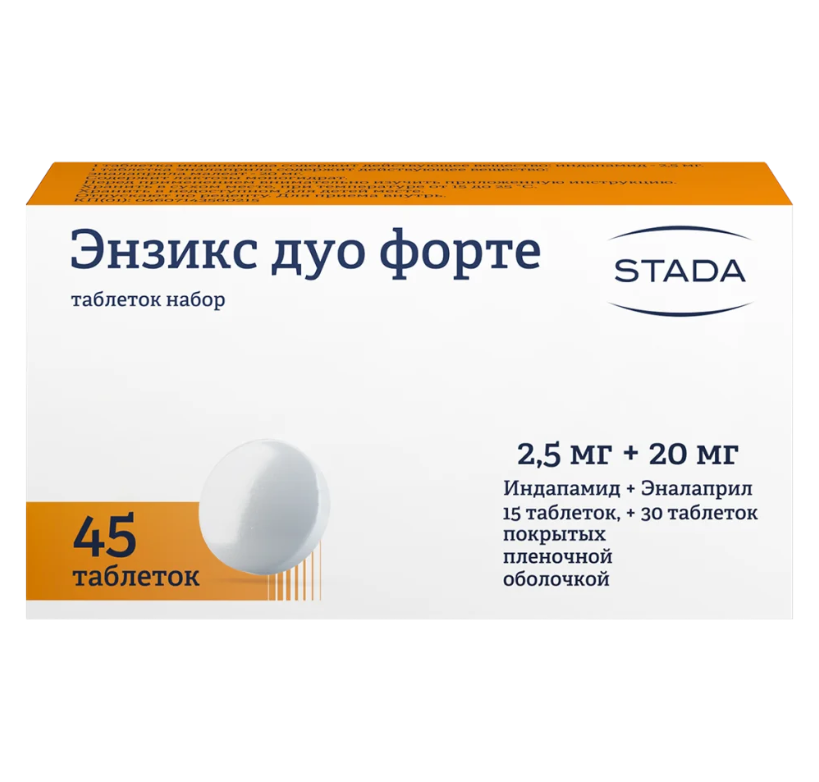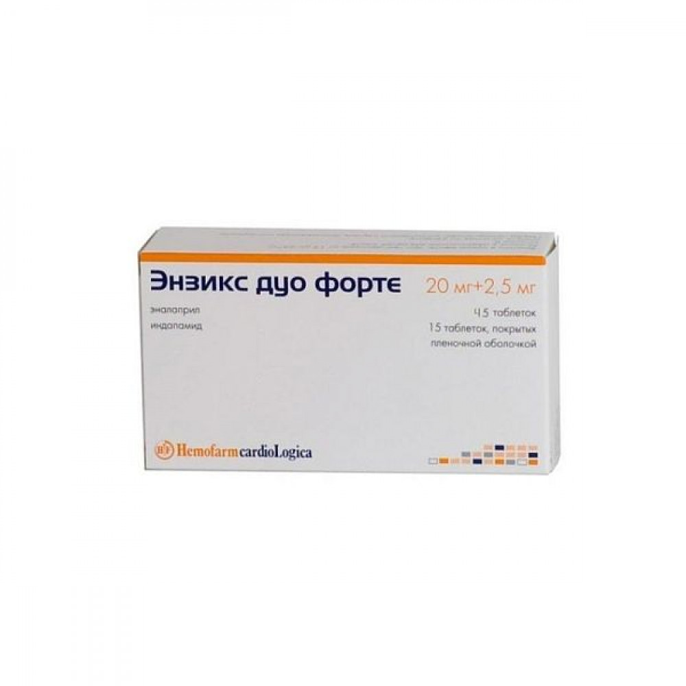 ЭНЗИКС ДУО ФОРТЕ содержит два отдельных лекарственных средства в одной упаковке: ингибитор ангиотензинпревращающего фермента (АПФ) ЭНАЛАПРИЛ и диуретическое средство ИНДАПАМИД.