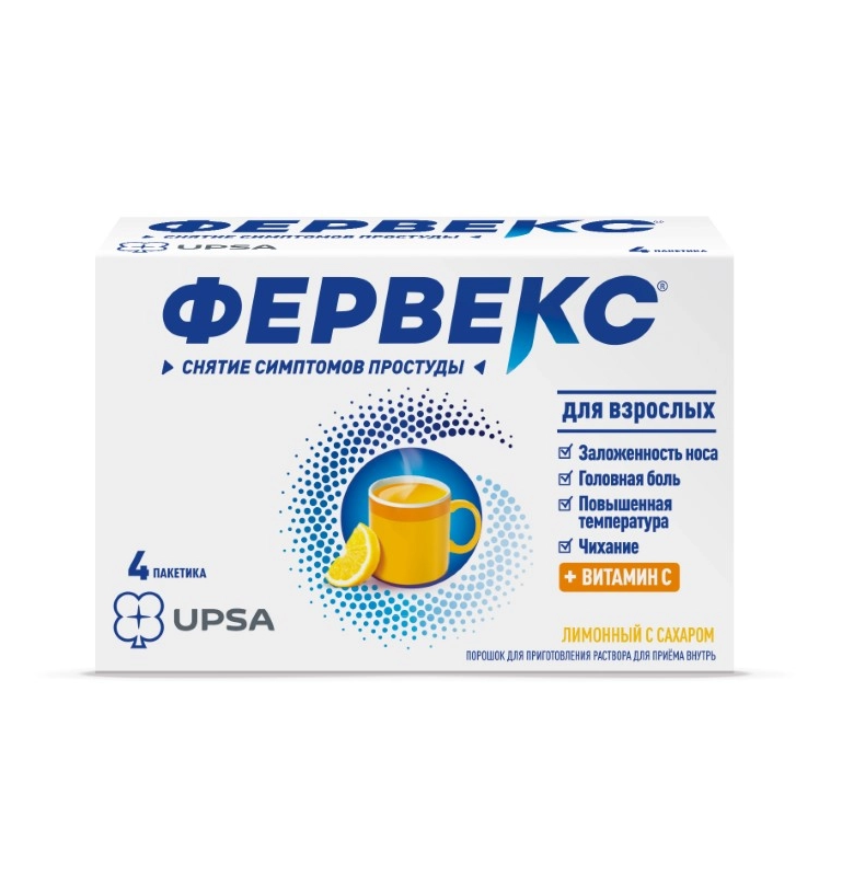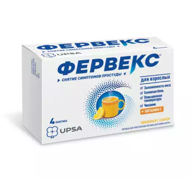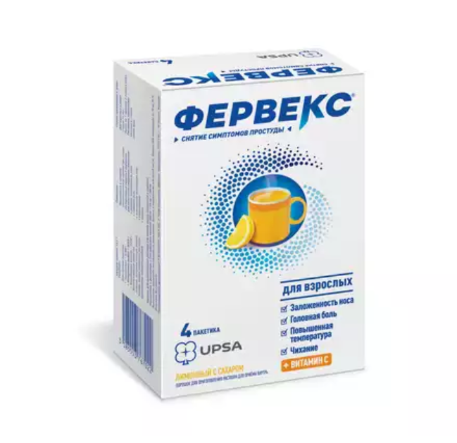 Фервекс® — комбинированный препарат, который содержит парацетамол, фенирамин и аскорбиновую кислоту. Парацетамол — ненаркотический анальгетик, блокирует циклооксигеназу, преимущественно в центральной нервной системе, воздействуя на центры боли и терморегуляции оказывает анальгезирующее и жаропонижающее действие.