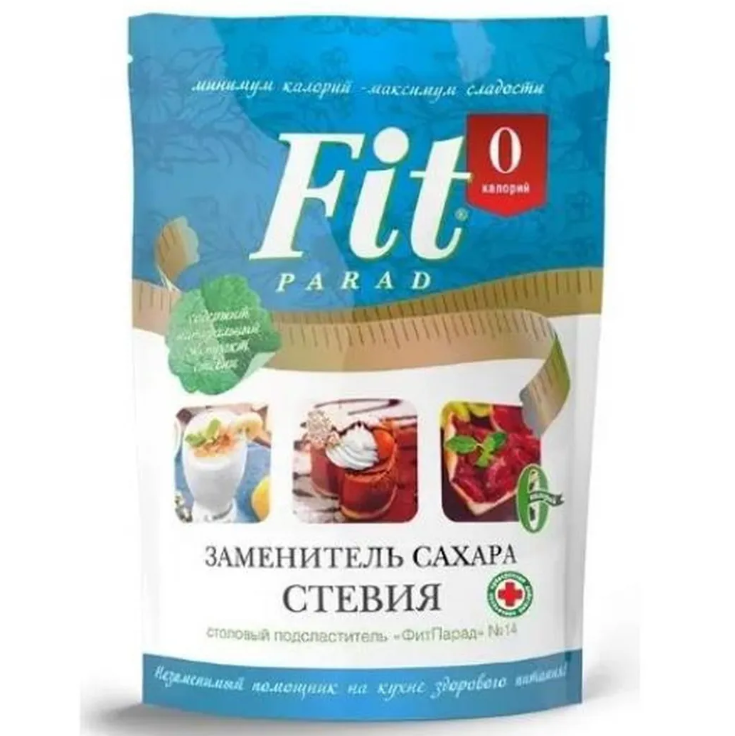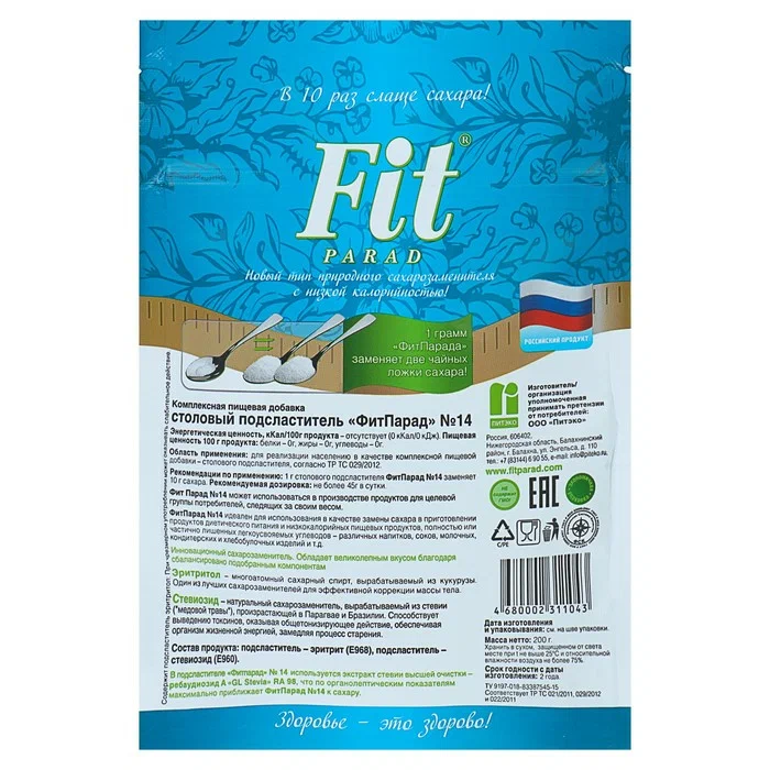 1 г столового подсластителя ФитПарад №14 заменяет 10 г сахара. Рекомендуемая дозировка: не более 45 г в сутки.