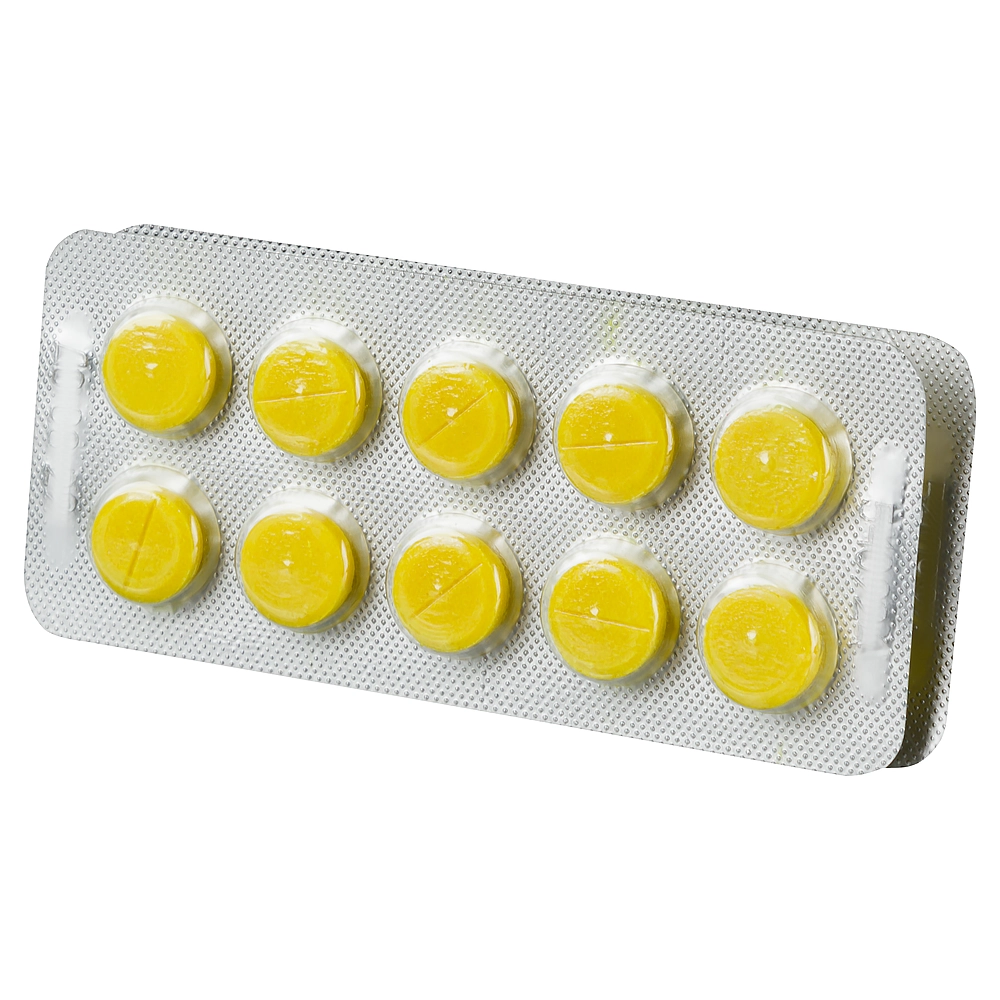 Таблетки жёлтого или зеленовато-жёлтого цвета с неравномерной окраской поверхности, плоскоцилиндрической формы, с фаской и риской.