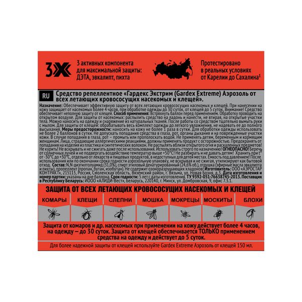 Средство безопасно, его можно наносить на кожу или одежду и снаряжение из натуральных тканей. Аэрозоль от комаров и других летающих насекомых активен более 4 часов при применении на кожу, и до 30 суток при нанесении на одежду. Защита от клещей действует до 5 суток только при обработке одежды и при желании может быть усилена средством от клещей Gardex Extreme.