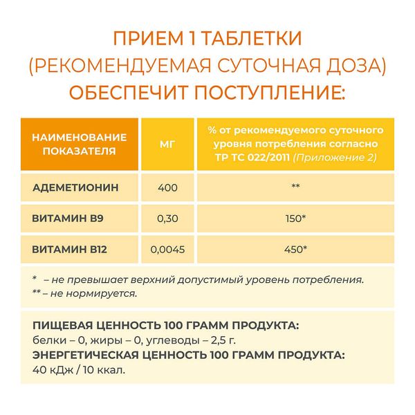 Рекомендуется  в качестве биологически активной добавки к пище – дополнительного источника витаминов В9, В12, содержит Ѕ-Аденозил-L-метионина Дисульфата Тозилат. Ѕ-Аденозил-Lметионина Дисульфата Тозилат способствует защите клеток печени, обладает также антидепрессивной активностью.