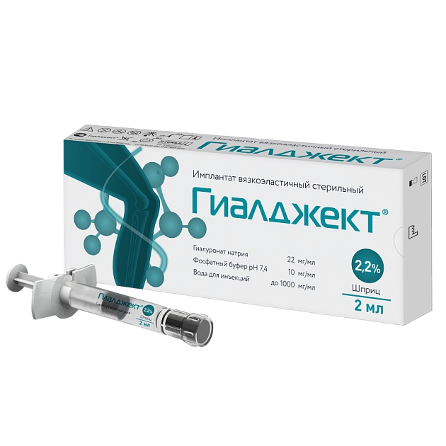 Гиалуроновая кислота, входящая в состав Имплантата ГИАЛДЖЕКТ®, имеет молекулярную массу 2,2 млн. дальтон, близкую к естественной гиалуроновой кислоте человека, и оказывает положительный эффект после введения при диагнозе остеоартроз (остеоартрит). Внутрисуставное введение Имплантата ГИАЛДЖЕКТ® восстанавливает физиологические и реологические свойства синовиальной жидкости сустава, пораженного остеоартрозом. Вследствие этого уменьшается боль и дискомфорт, улучшается подвижность в суставе. Введение в проекцию зоны повреждения связочного аппарата, околосухожильное пространство (сухожильные каналы) Имплантата ГИАЛДЖЕКТ® приводит к уменьшению или полному купировании болевого синдрома.