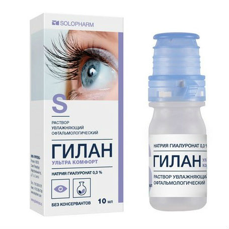 При систематическом ношении контактных линз рекомендуется применение офтальмологического раствора Гилан Ультра комфорт, который способствует длительному увлажнению глаза, так как его действие идентично натуральной слезной жидкости. Офтальмологический раствор Гилан Ультра комфорт не содержит консервантов, поэтому отсутствует нежелательное токсическое действие на ткани глаза. Раствор имеет показатель вязкости 9,0 - 18,0 мПа·с.