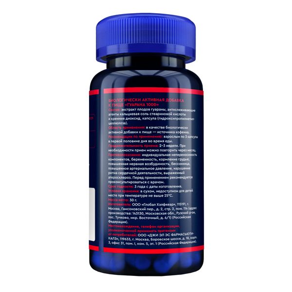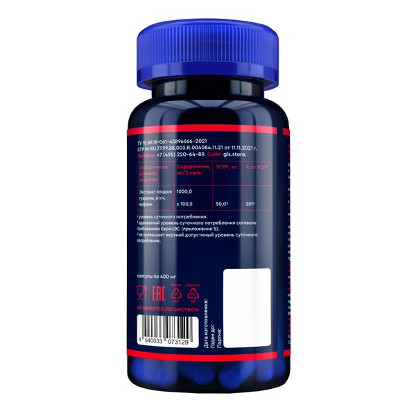 Экстракт плодов гуараны, антислеживающие агенты кальциевая соль стеариновой кислоты и кремния диоксид, капсула (носитель гидроксипропил-метилцеллюлоза или желатин).