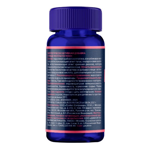 Гидролизат рыбного коллагена, L-аскорбиновая кислота, тальк (Е553iii), гиалуроновая кислота, кремния диоксид (Е551), капсула (гидроксипропилметилцеллюлоза Е464).