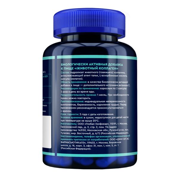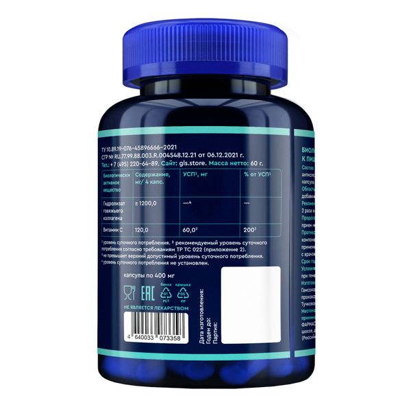 Гидролизат животного (говяжьего) коллагена, L-аскорбиновая кислота, антислеживающий агент тальк, капсула (желатин).
