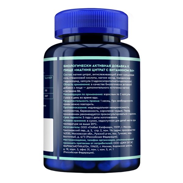 «Магния цитрат с витамином В6» - биологически активная добавка к пище - гидроксипропилметилцеллюлозные капсулы. Подходит для вегетарианцев.