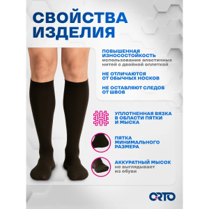 Гольфы компрессионные мужские 316 ORTO 1 класс компрессии (18-22 мм рт. ст.) производятся из современного эластичного полотна, нити которого имеют двойную оплетку (двойное армирование) для улучшения износостойкости и создают умеренную компрессию по всей длине, снижаясь от щиколотки наверх. В составе материала высокое содержание натурального хлопка, что придает трикотажу комфорт при использовании. Благодаря особой уплотненной вязке, пяточная и носочная части более укреплены, а плоские швы не оставляют следов на теле. В верхней части, для фиксации на ноге вывязана широкая мягкая резинка, которая не создает перетяжек.