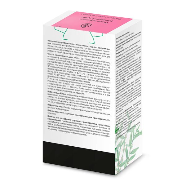 Смесь кусочков стеблей, листьев, цветков, плодов. Цвет кусочков стеблей серовато-зелёный, светло-коричневый, листьев — серовато-зелёный, зелёный, коричневато-зелёный, плодов — тёмно-коричневый, фрагментов цветка — беловатый, кремовый. Запах слабый. Вкус водного извлечения слегка вяжущий.