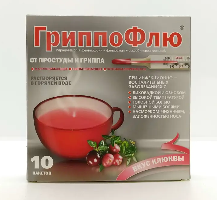 ГриппоФлю от простуды и гриппа порошок для приготовления раствора для приема внутрь со вкусом клюквы пакет 13г №10