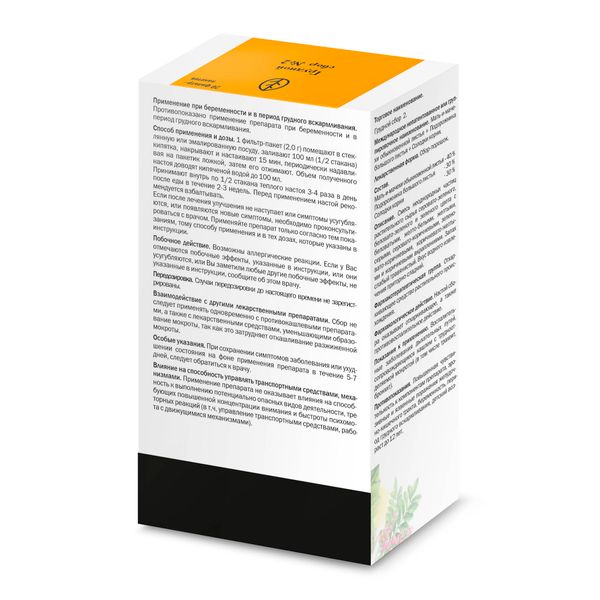 1 фильтр-пакет (2 г) сбора помещают в эмалированную посуду, заливают 100 мл (½ стакана) кипятка, накрывают и настаивают 15 мин, периодически надавливая на пакетик ложкой, затем его отжимают. Объём полученного настоя доводят кипячёной водой до 100 мл.