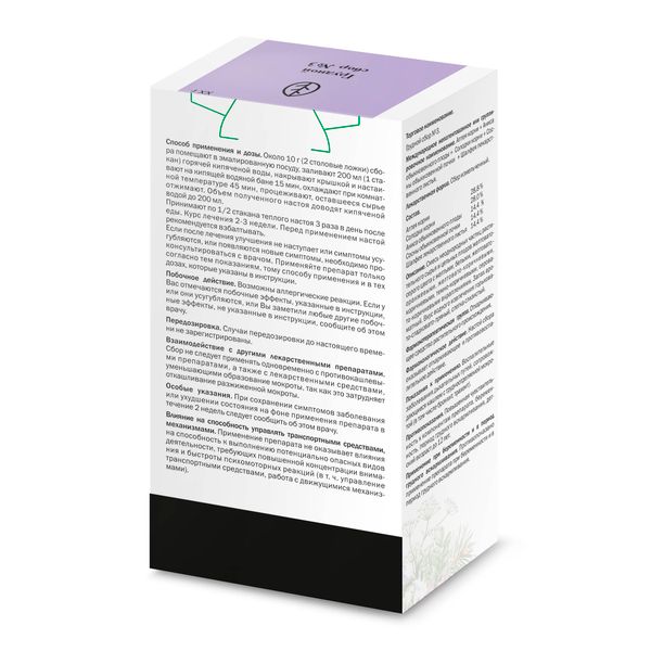 Сбор не следует применять одновременно с противокашлевыми препаратами, а также с лекарственными средствами, уменьшающими образование мокроты, так как это затрудняет откашливание разжиженной мокроты.