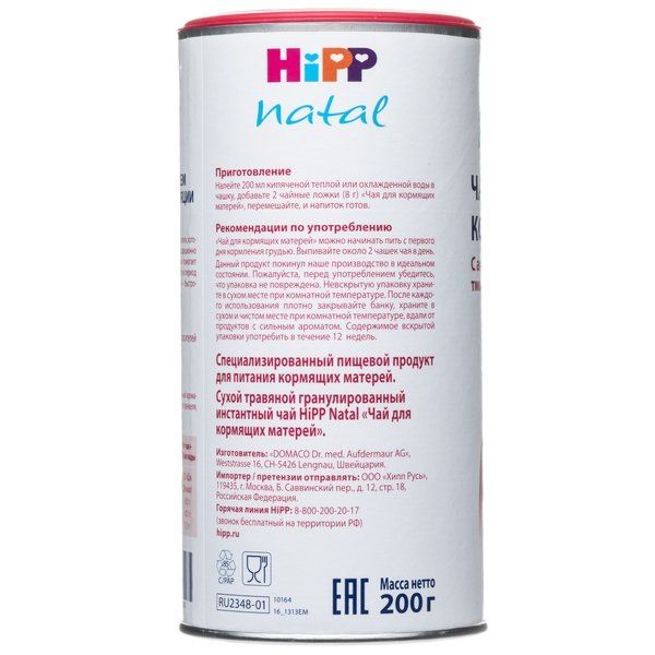 "Чай для кормящих матерей" HiPP Natal – быстрорастворимый, легкий в приготовлении напиток с анисом, фенхелем и тмином. Чай содержит целый ряд полезных трав, традиционно используемых для стимуляции лактации. Напиток поддержит выработку грудного молока, поможет восполнить возросшую потребность в жидкости в период кормления грудью. Очень вкусный и ароматный напиток, который можно пить как в теплом, так и в охлажденном виде.